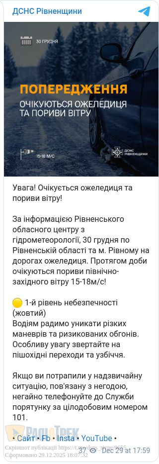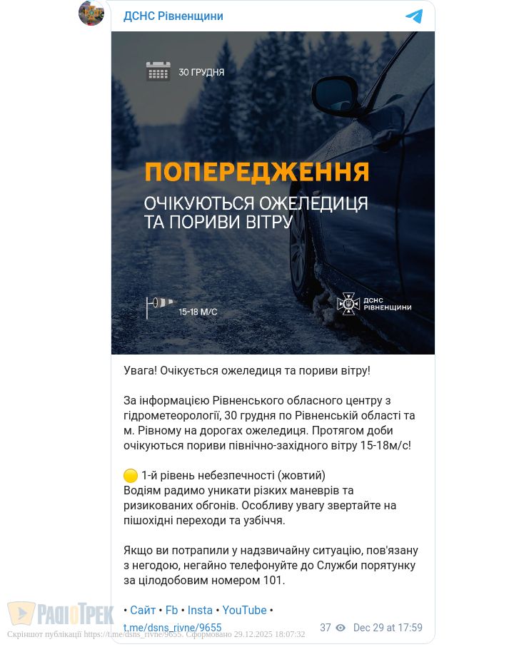 За інформацією Рівненського обласного центру з гідрометеорології, 30 грудня по Рівненській області та м. Рівному на дорогах ожеледиця. Протягом доби очікуються пориви північно-західного вітру 15-18м/с!