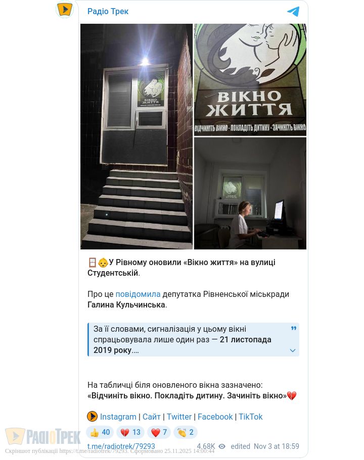 Немовля поклали у вікно життя у рівненському пологовому будинку. Це сталося сьогодні, близько години тому, — повідомила депутатка Рівнеради Галина Кульчинська.
