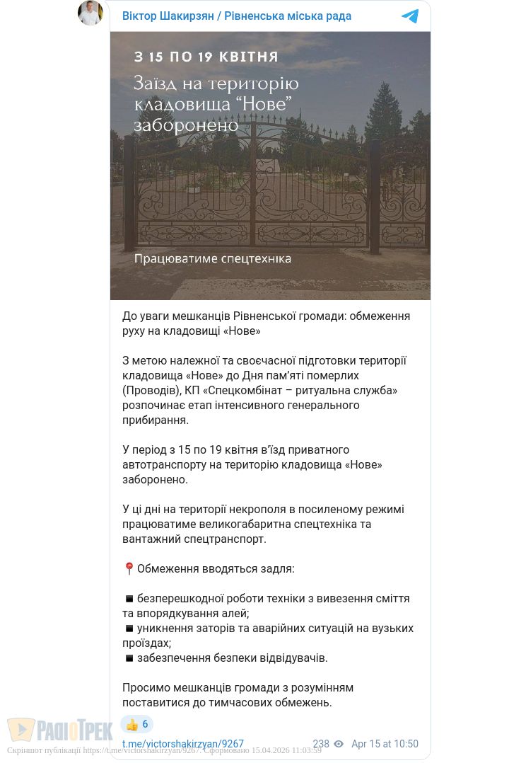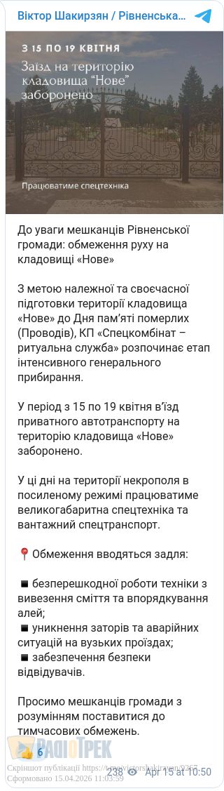 На 5 днів у Рівному обмежать в’їзд до кладовища «Нове». Відсьогодні приватним транспортом заїхати на територію цвинтаря буде неможливо. Там проведуть генеральне прибирання перед Провідною неділею.