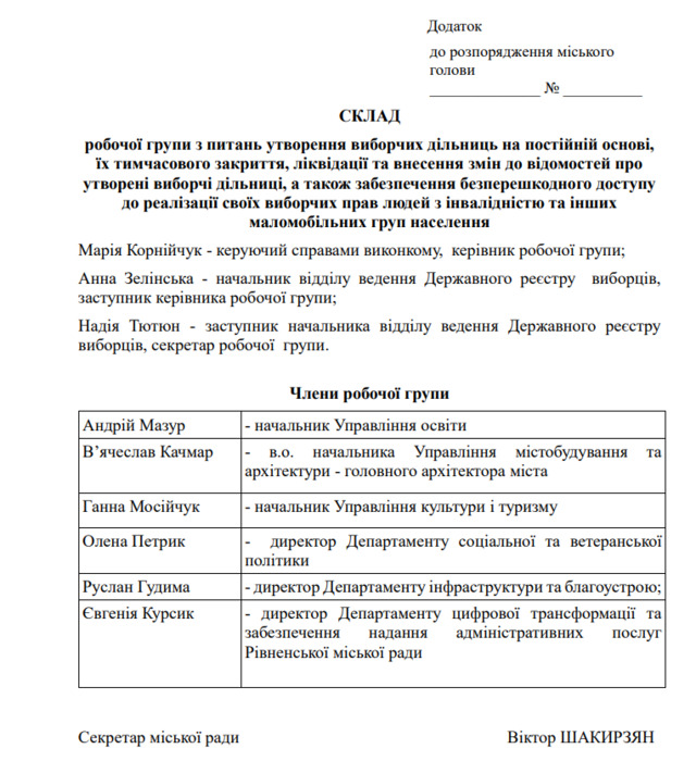 У Рівному створили робочу групу для впорядкування виборчих дільниць. Про це йдеться у розпорядженні виконуючого обов’язків міського голови.