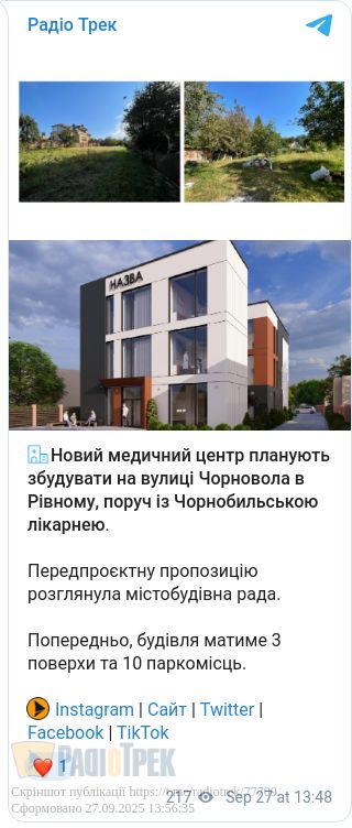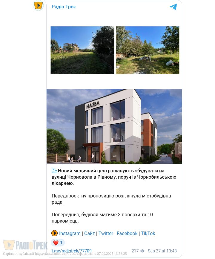 Новий медичний центр планують збудувати на вулиці Чорновола в Рівному, поруч із Чорнобильською лікарнею.