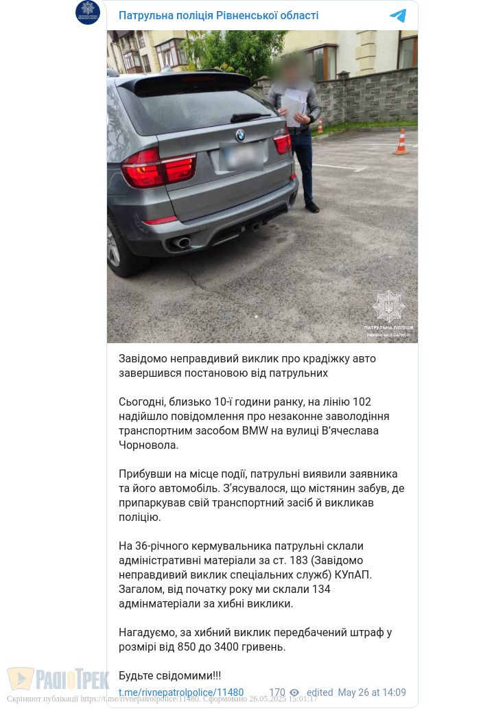 За свідомо неправдивий виклик на 36-річного рівнянина склали адмінматеріал. Чоловіку загрожує близько 3 тисяч грн штрафу.