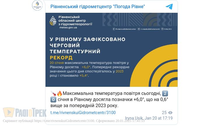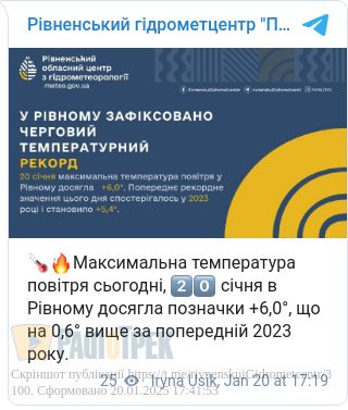 Напередодні температура повітря піднялася до 6 градусів вище нуля, чим на 0,6 градуса перевищила дворічний максимум, повідомили у Рівненському гідрометцентрі.