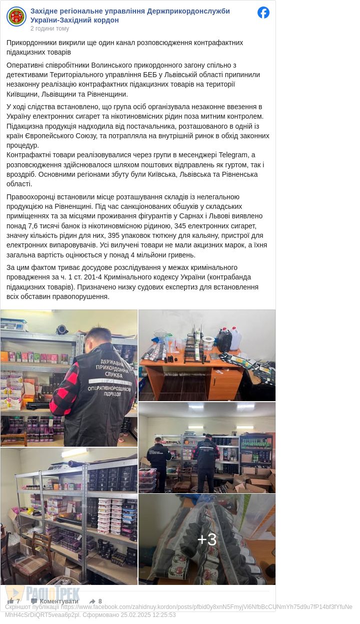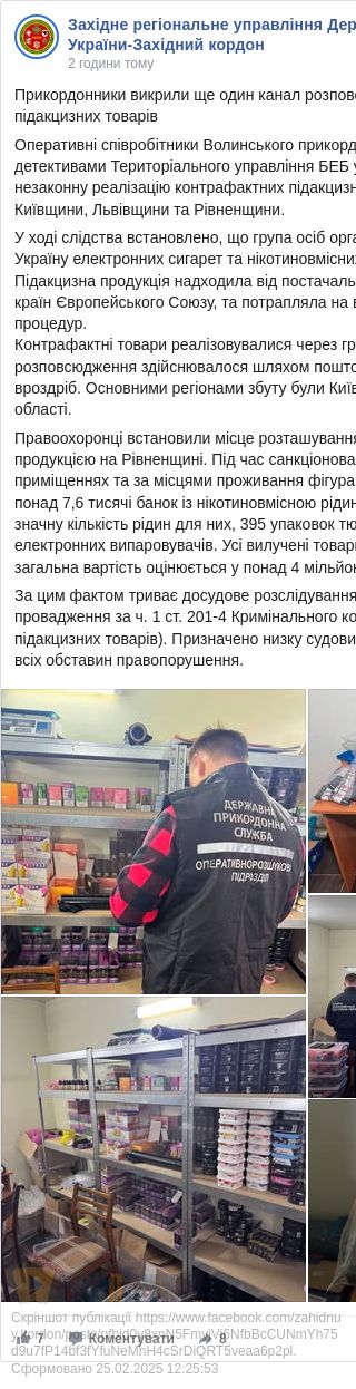 Під час санкціонованих обшуків у складських приміщеннях та за місцями проживання фігурантів у Сарнах і Львові виявлено понад 7,6 тисячі банок із нікотиновмісною рідиною, 345 електронних сигарет, значну кількість рідин для них, 395 упаковок тютюну для кальяну, пристрої для електронних випаровувачів.
