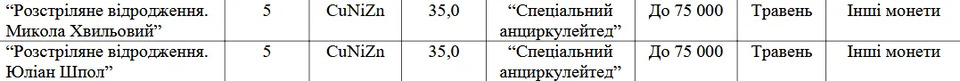 У травні Нацбанк має намір випустити одразу дві нові пам'ятні монети у 5 грн. Вони будуть присвячені представникам українського духовно-культурного та літературно-мистецького покоління 20-х та 30-х років XX століття – Розстріляного відродження – Миколі Хвильовому та Юліану Шполу.