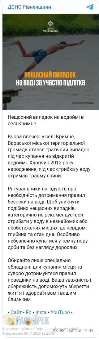 12-річний хлопець травмував спину, стрибаючи у воду на Рівненщині