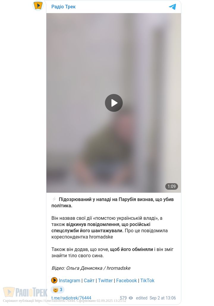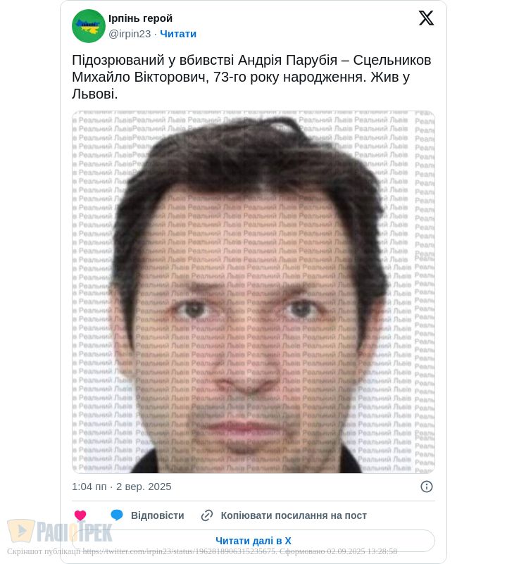 На уточнююче запитання, - чому він обрав своєю жертвою саме Парубія, підозрюваний сказав, що, якби побачив Порошенка, «то був би Пєтя».