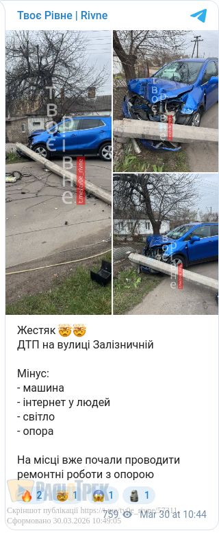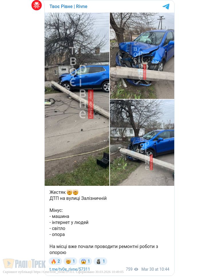 Удар у опору: ДТП на Залізничній у Рівному спричинила відключення електрики (ФОТО)