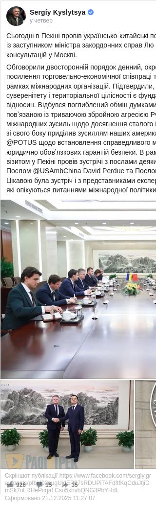 У ньому Перший заступник міністра закордонних справ України повідомляє про свій візит до Пекіну та проведення там консультацій: