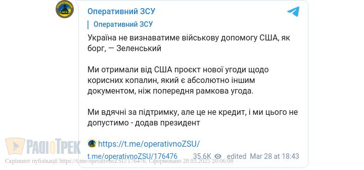 Україна не визнаватиме військову допомогу США, як борг, — заявив президент Зеленський.