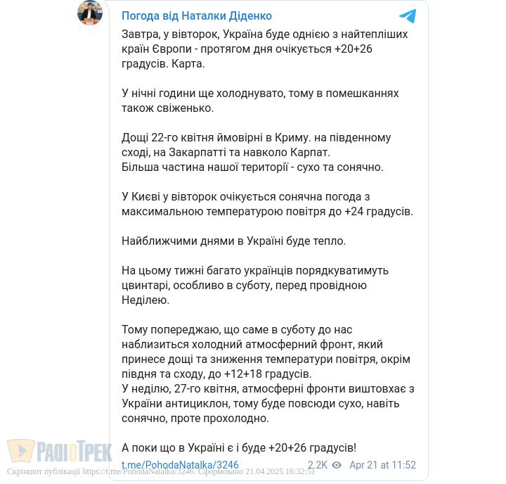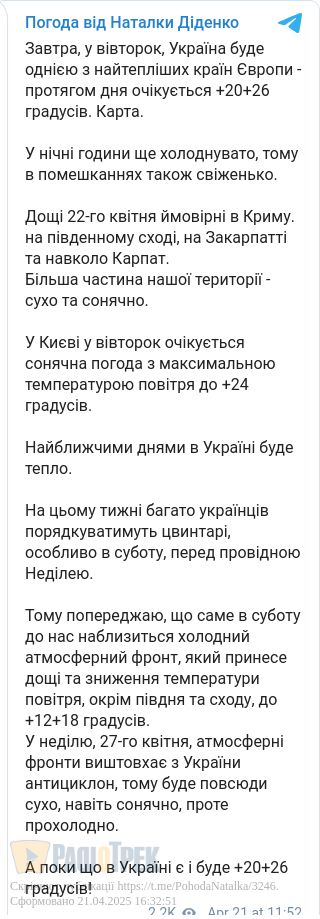 Завтра, 22 квітня, Україна буде однією з найтепліших країн Європи.