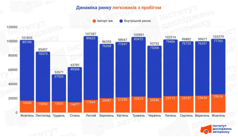 У жовтні 2025 року українці активно купували вживані автомобілі. За даними Інституту досліджень авторинку, на внутрішньому ринку зафіксували 77 763 перепродажі легковиків, а ще 25 616 авто завезли з-за кордону та вперше зареєстрували в Україні.