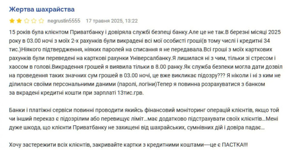 Клієнтка ПриватБанку поскаржилася, що вночі з її карток зникли всі гроші, включно з кредитними — загалом 34 тисячі гривень.