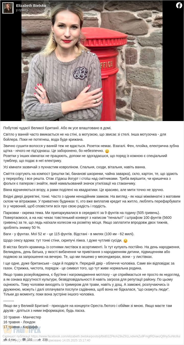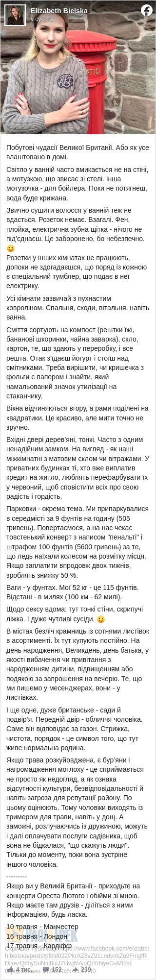 Єлизавета Бєльська співавторка книжки «Як перейти на українську», видавець, концертний директор і дружина Антіна Мухарського у своєму дописі на Facebook розповіла про побутові чудасії Великої Британії.