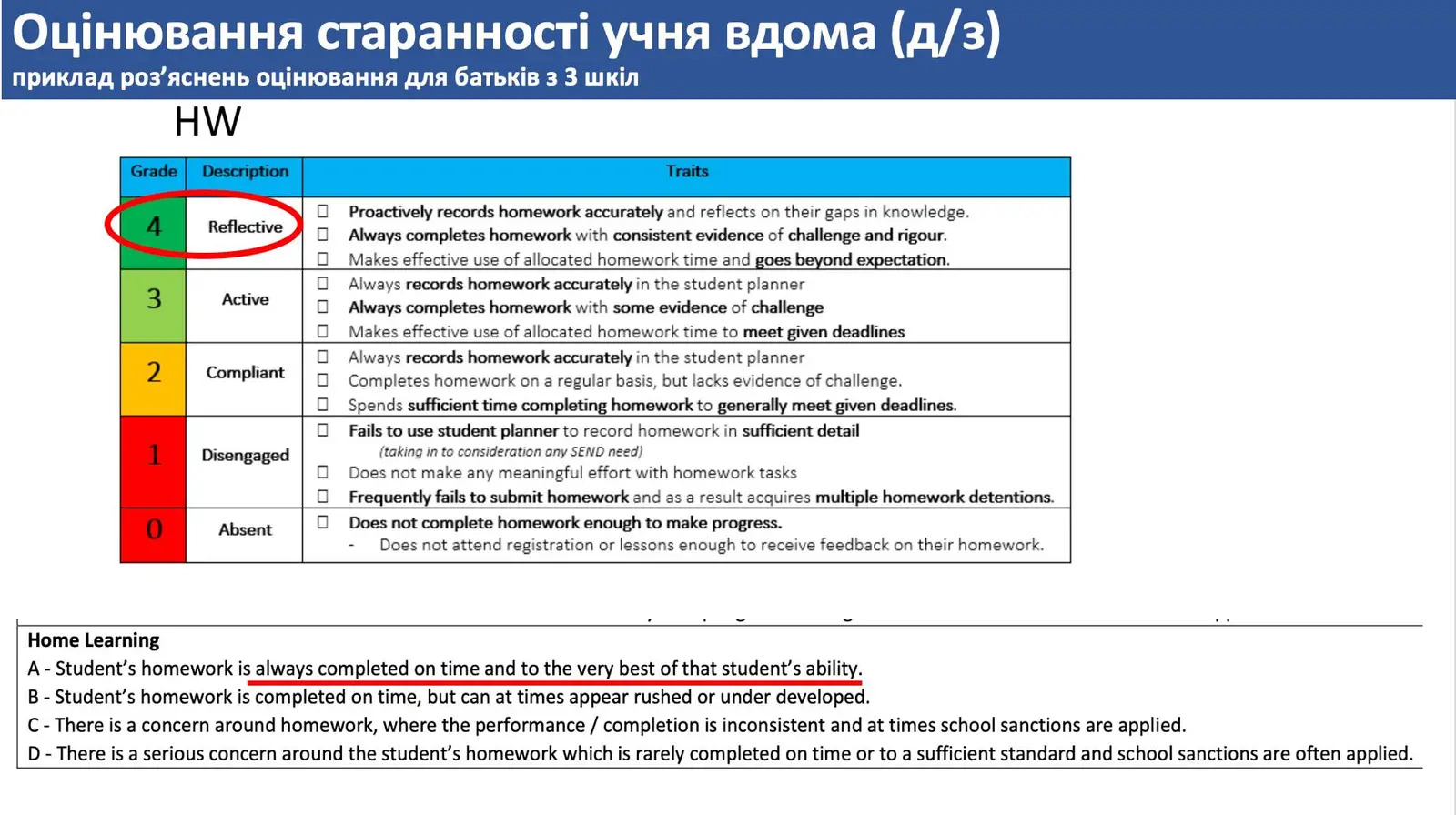 Важливим також є той факт, що оцінка за д/з не «змішується» з оцінками за класну роботу, як це, зазвичай, робиться в Україні. Причина така: оцінювання д/з свідчить, на думку британців, про здатність ПРАЦЮВАТИ САМОСТІЙНО, що є іншою важливою навичкою, яку варто вимірювати окремо.