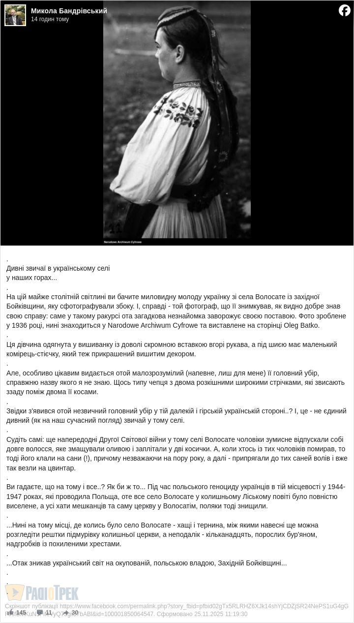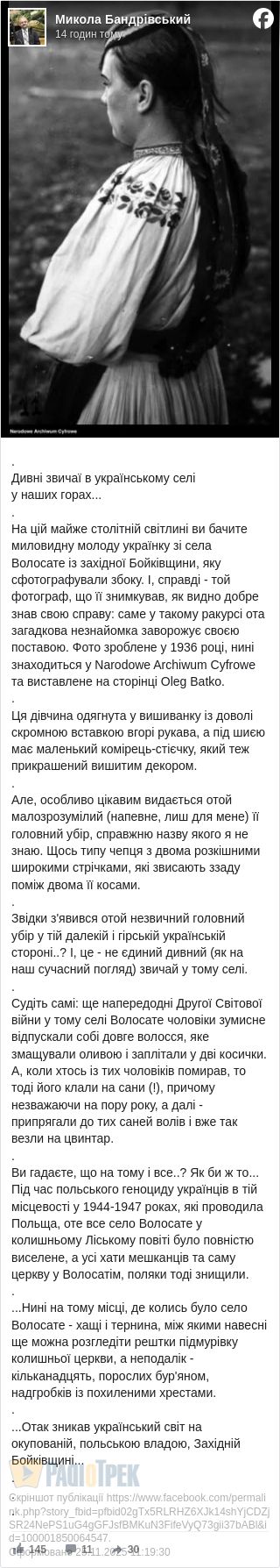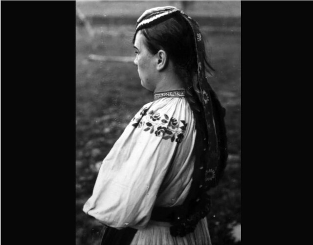 На цій майже столітній світлині ви бачите миловидну молоду українку зі села Волосате із західної Бойківщини, яку сфотографували збоку.