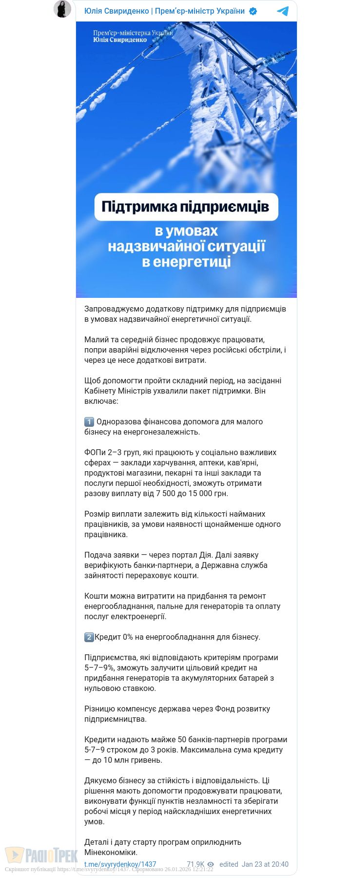 Про запуск такої підтримки повідомила прем’єр-міністр України Юлія Свириденко. Програма має допомогти малому та середньому бізнесу працювати навіть під час перебоїв з електропостачанням.