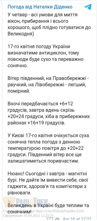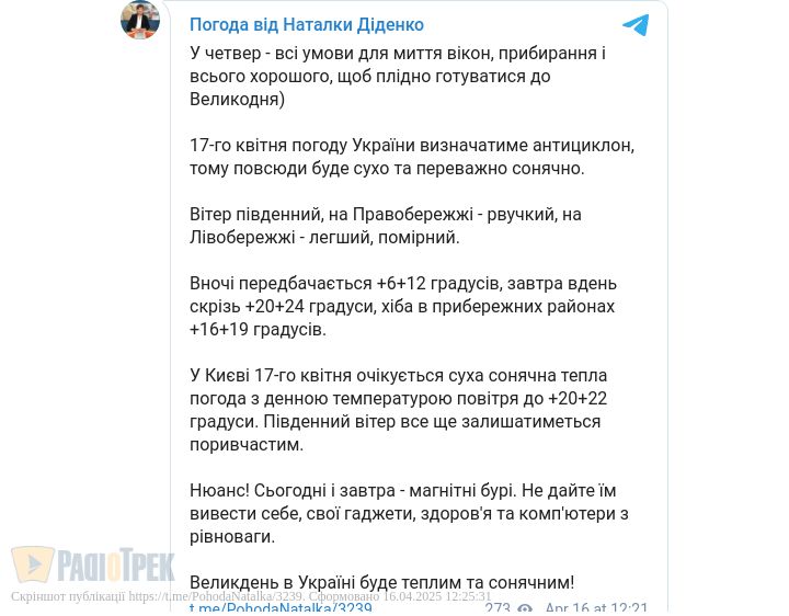 Завтра, 17 квітня, погоду в Україні визначатиме антициклон.
