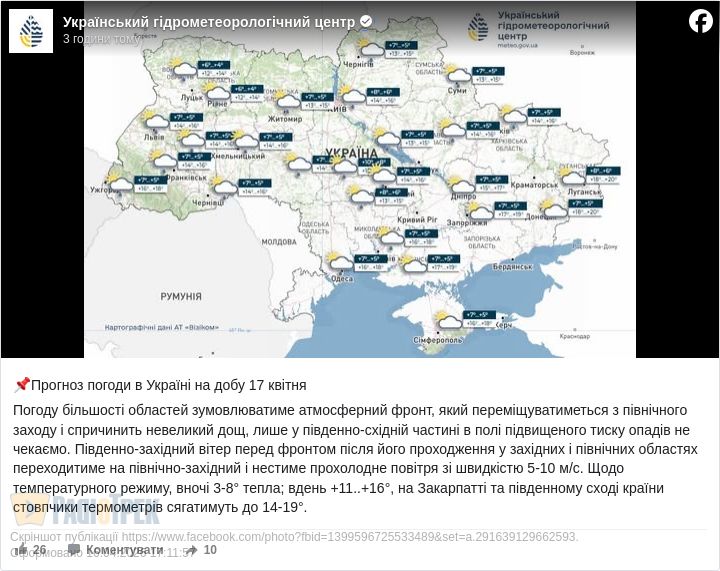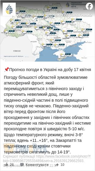 Завтра, 17 квітня, погоду в більшості областей України зумовлюватиме атмосферний фронт, який переміщуватиметься з північного заходу та спричинить невеликий дощ, повідомили в Українському гідрометцентрі.