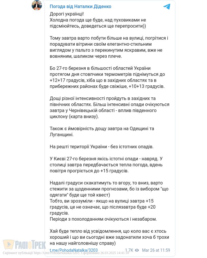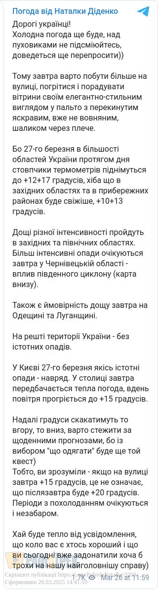 Завтра, 27 березня, в Україні ще очікуються періоди похолодання. В більшості областей країни протягом дня буде до +12…+17 градусів. В західних областях та в прибережних районах +10…+13 градусів.