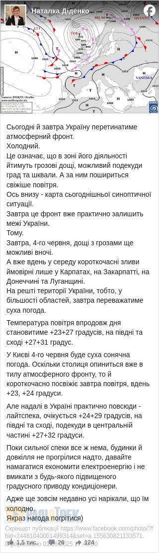 Поки сильної спеки все ж нема, будинки й довкілля не прогрілися надто, намагаймось економити електроенергію і не вмикати з будь-якого підвищеного градусного приводу кондиціонери, – зауважила синоптик.