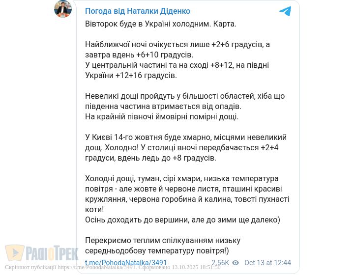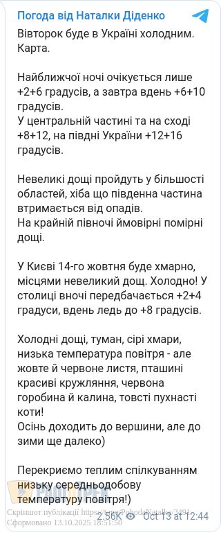 Завтра, 14 жовтня, в Україні очікується холодна погода.