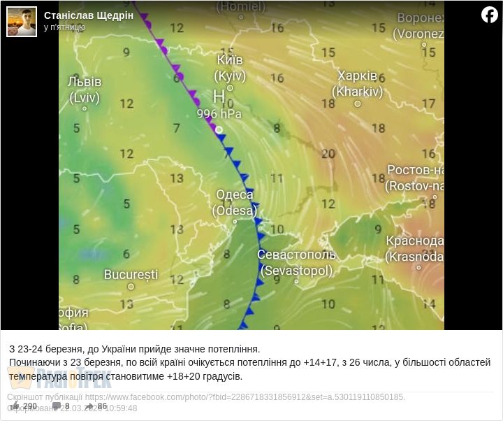 Відзавтра, 23 березня, по всій країні очікується підвищення градусів до +14...+17, повідомив народний синоптик Станіслав Щедрін.