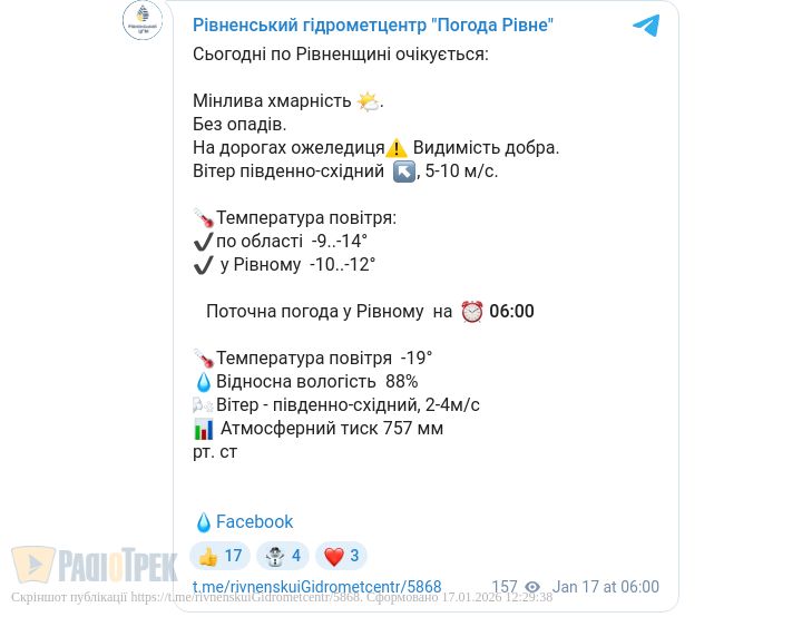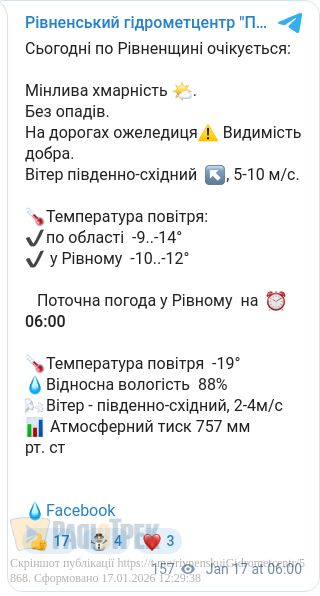 До слова, за прогнозом Рівненського гідрометцентру, станом на 6 ранку в області було до -19 градусів.