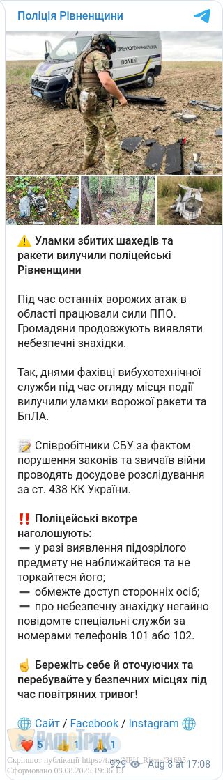 Так, днями в одному з районів краю знайшли уламки ворожої ракети та БпЛА. За фактом порушення законів та звичаїв війни працівники СБУ проводять досудове розслідування, повідомили у відділі комунікації поліції Рівненщини.