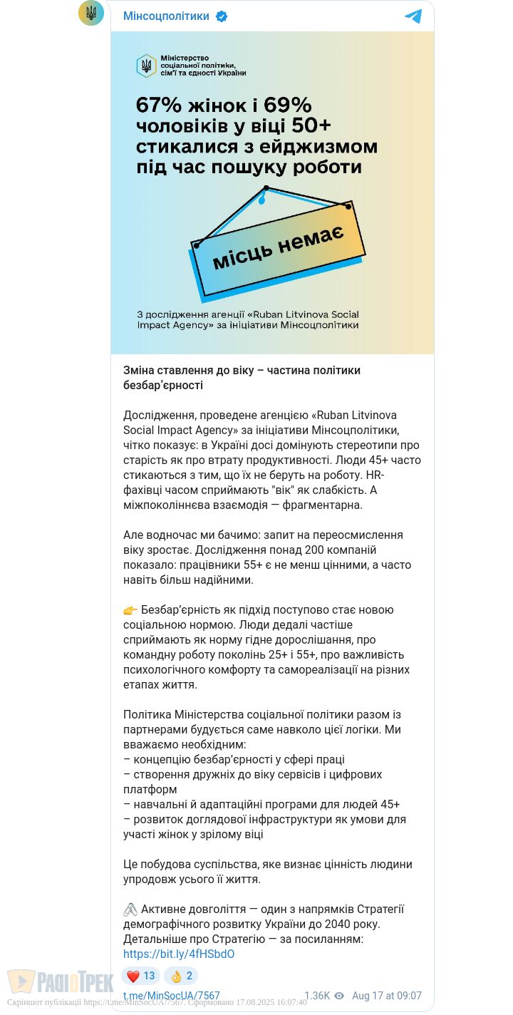 Дослідження, проведене на замовлення Мінсоцполітики, показало: в Україні досі поширені стереотипи про вік. Людей після 45 років часто не беруть на роботу, HR-менеджери сприймають їх менш конкурентними, а співпраця поколінь відбувається рідко й уривками.