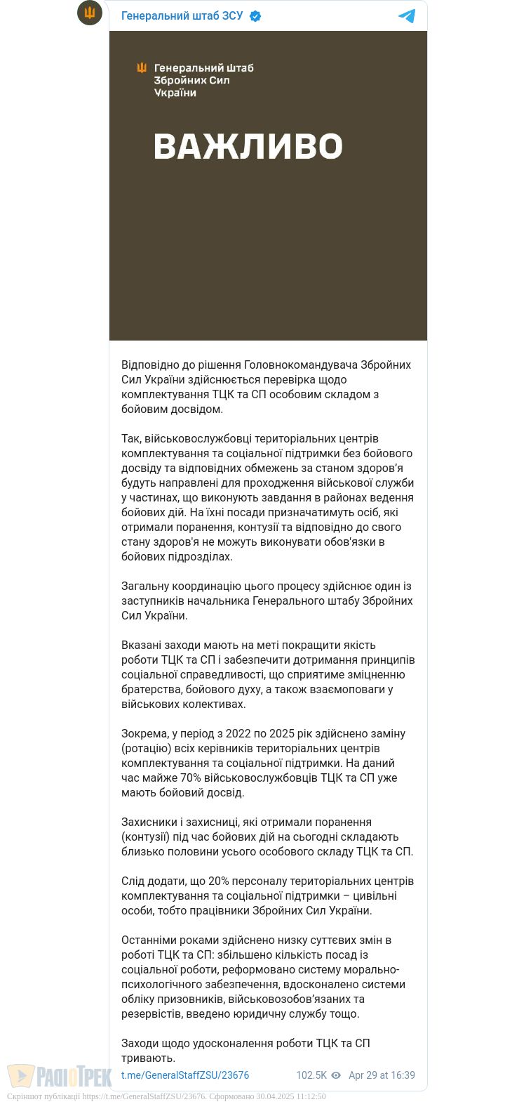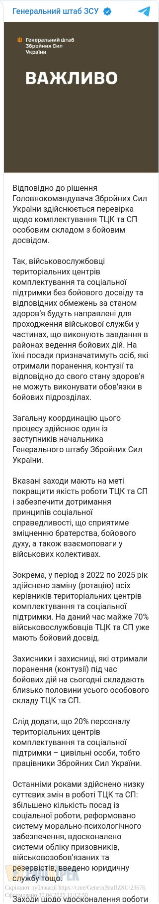 Там також зазначають, що це не перша заміна штатного складу ТЦК. Зокрема, за три роки повномасштабної війни була здійснена ротація всіх керівників Терцентрів. Внаслідок усіх цих змін на сьогодні майже 70% військових, що служать у ТЦК — це люди із бойовим досвідом, які встигли повоювати.