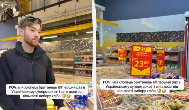 Мій хлопець британець вперше в українському супермаркеті, й він у шоці від кількості вибору хліба, – ділиться дівчина у ролику.