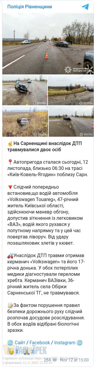 На Сарненщині у ДТП травмувалися батько та донька. Аварія сталася сьогодні, 12 листопада, близько 06:30 на трасі «Київ–Ковель–Ягодин» поблизу Сарн.