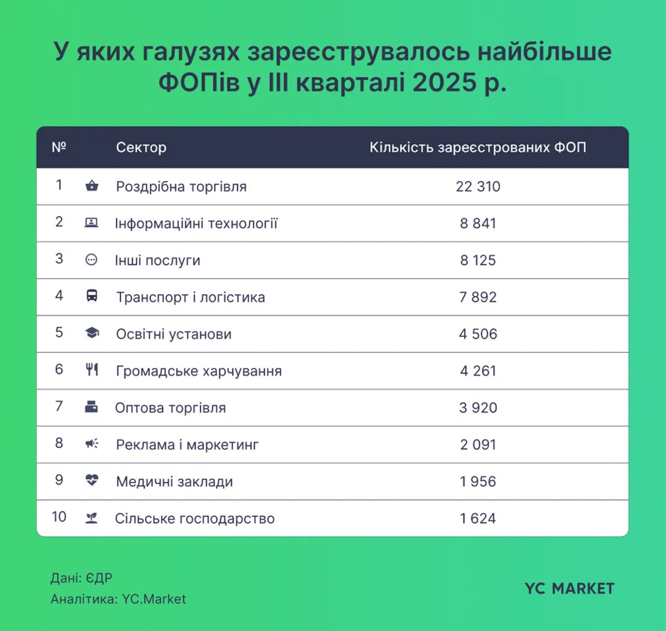 У липні-вересні 2025 року українці зареєстрували 77,4 тис. ФОП — це на чверть більше, ніж у попередньому кварталі. Темпи започаткування власної справи значно прискорилися і у порівнянні з торішнім рівнем: третій квартал 2025-го дав майже на 38% більше нових реєстрацій ФОП, ніж аналогічний період 2024 року.