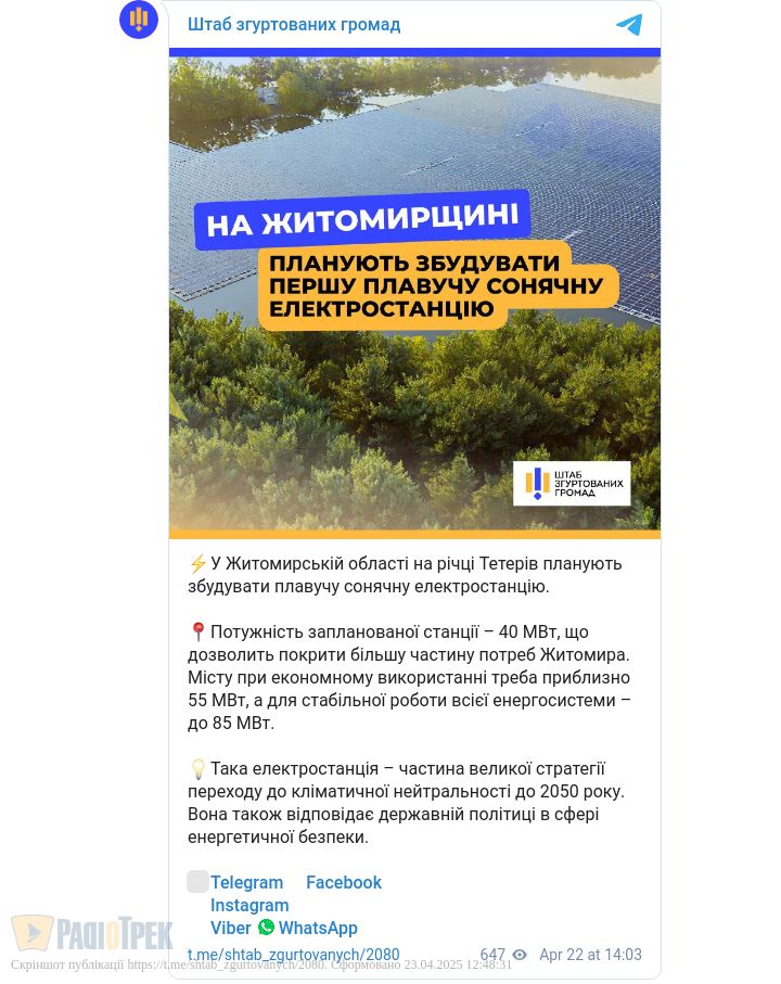 Про це повідомили в урядовій ініціативі «Штаб згуртованих громад». Там зазначили: СЕС хочуть збудувати на річці Тетерів.