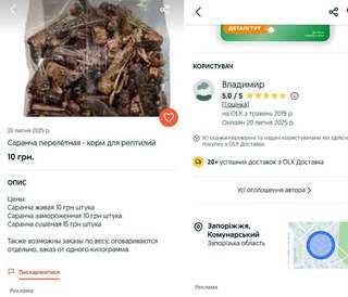 Згодом на тій же платформі для оголошень з’явилися й інші пропозиції. Жителі Запоріжжя також почали пропонувати сарану, встановивши ціну від 9 до 15 гривень за штуку, зауважуючи, що забрати товар потрібно самостійно.