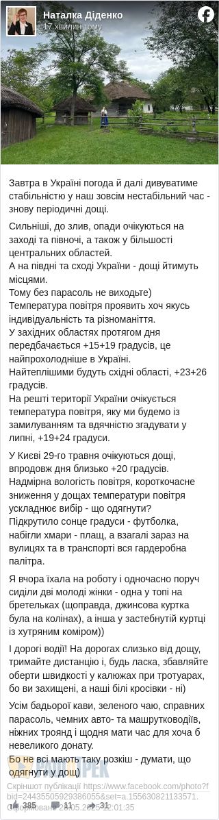 Завтра, 29 травня, в Україні знову очікуються періодичні дощі.