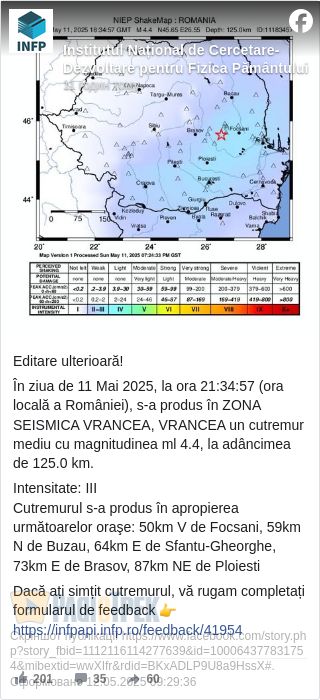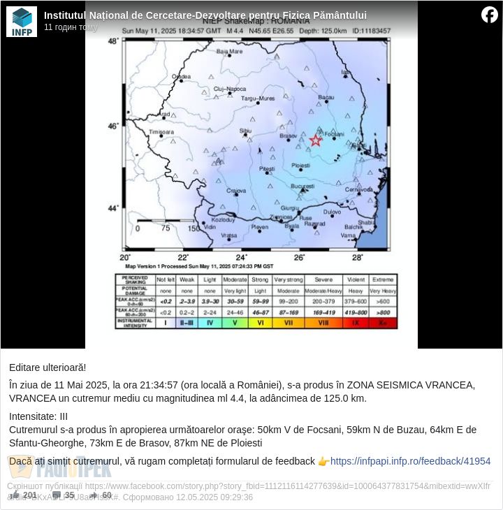 Як повідомили у Національному науково-дослідному інституті фізики Землі, природне явище магнітудою 4,4 сталося о 21:34:57 (за румунським часом). Землетрус виник на глибині 125 кілометрів.