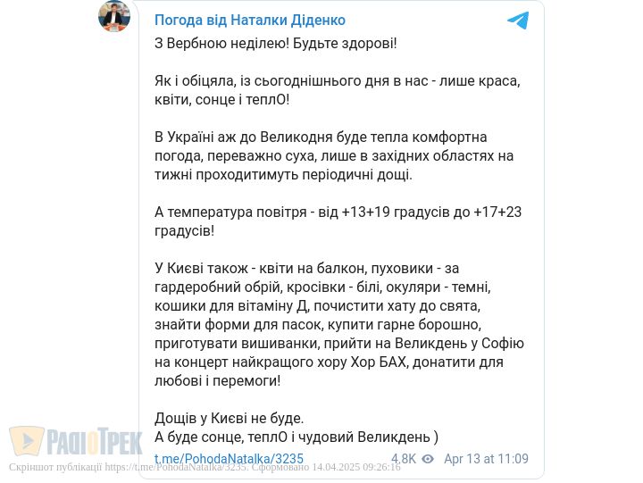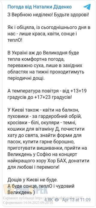 До слова, раніше синоптик повідомляла, що на Великдень очікується тепло до +14...+20 градусів. Втім, не виключено, що до кінця тижня прогноз може змінитися.