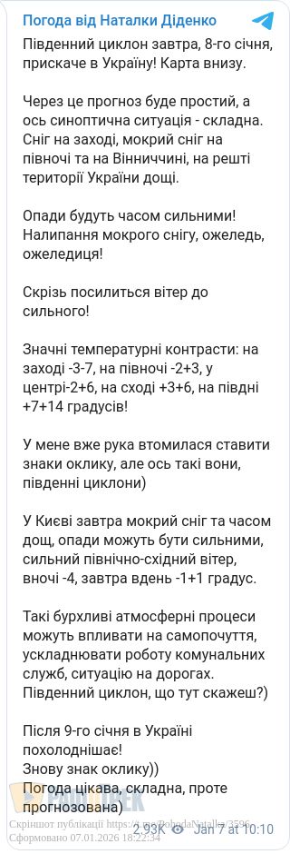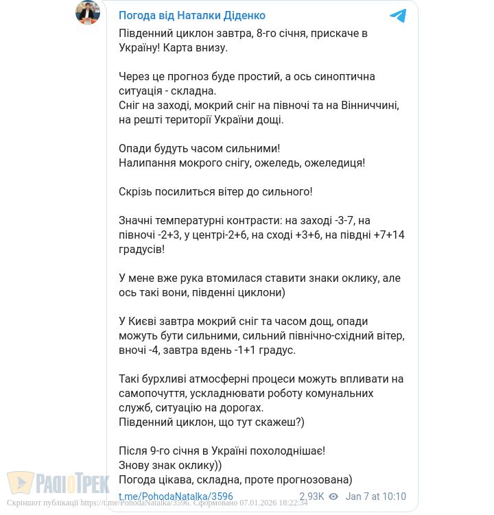 Завтра, 8 січня, Україну накриє південний циклон, який ускладнить синоптичну ситуацію, повідомила синоптик Наталка Діденко.