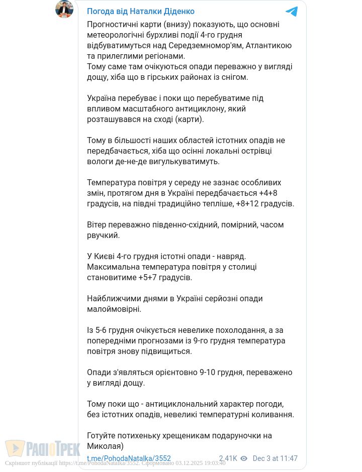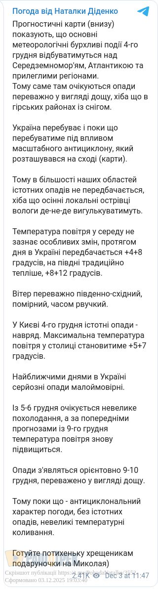 Вітер буде переважно південно-східний, помірний, часом рвучкий. Із 5-6 грудня в країні очікується невелике похолодання, але за попередніми прогнозами із 9 грудня температура повітря знову підвищиться.
