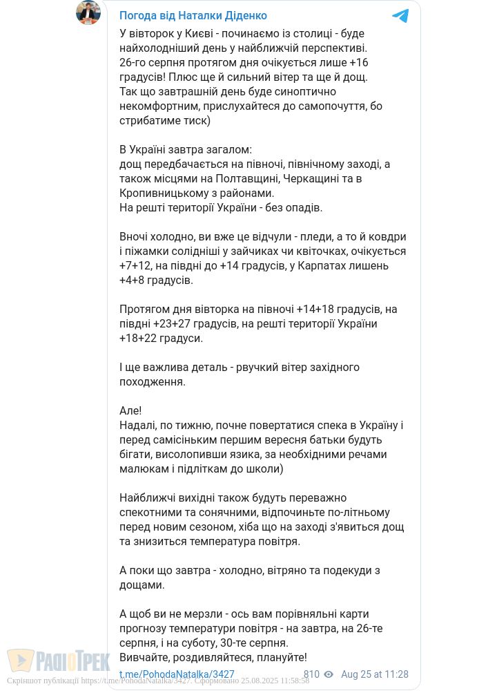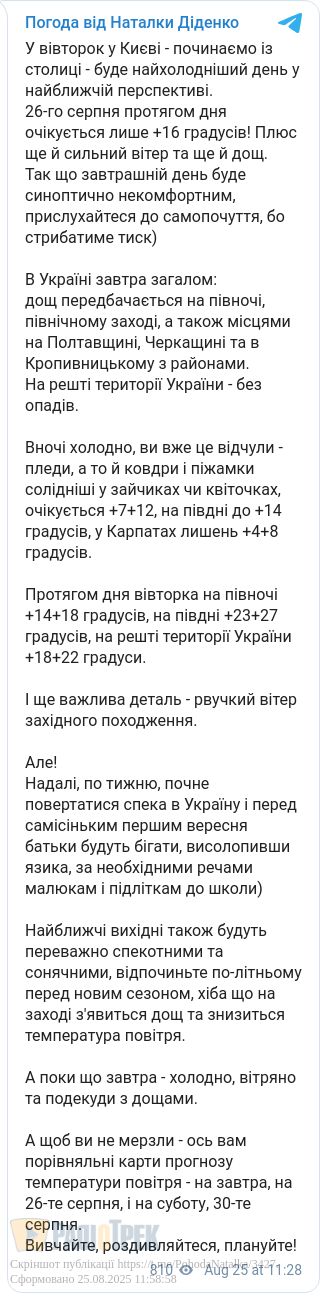 Завтра, 26 серпня, на Півночі країни, у північно-східних областях, а також місцями на Полтавщині, Черкащині та в Кропивницькому з районами очікується дощ, повідомила синоптик Наталка Діденко.