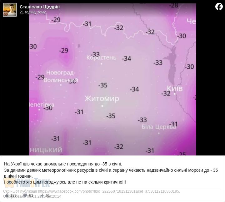 В пабліках вже активно розганяється інформація про екстремальні морози -35 і нижче по всій країні, що всі і все замерзне наприкінці січня. Така інформація не підтверджена. Ми слідкуємо за процесами в атмосфері і оперативно інформуватимемо, – написав Віталій Постригань в одному із дописів на своїй сторінці у Facebook.