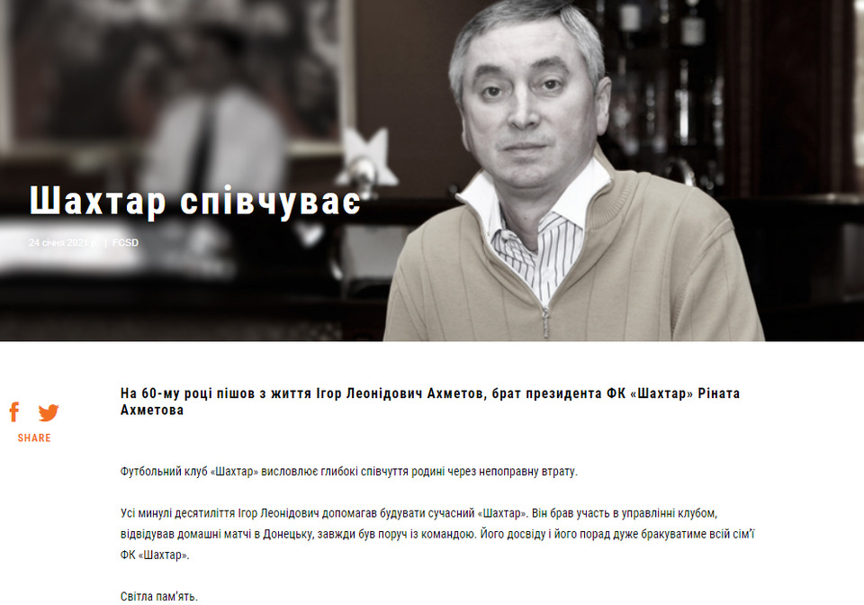 На сайті футбольного клубу "Шахтар" висловлюють глибокі співчуття родині Ахметова з непоправною втратою.