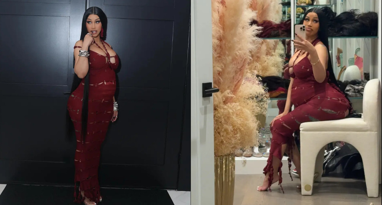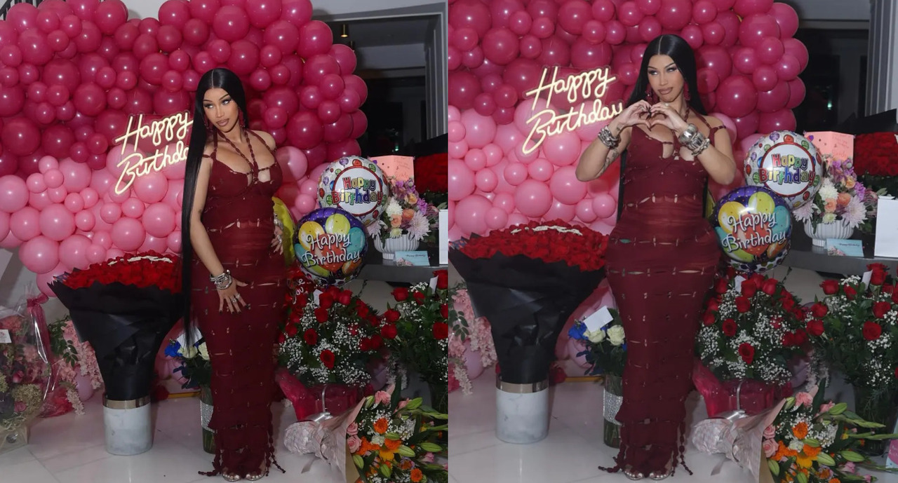 Карді Бі яскраво відсвяткувала своє 33-річчя, показавши округлий животик у бордовій обтислiй сукні з вирізами.