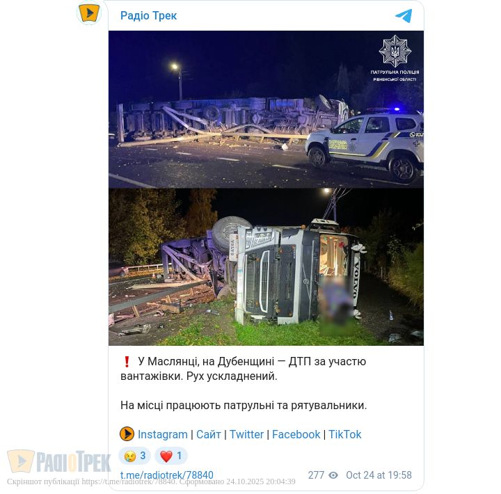 ДТП за участю вантажівки сталася у селі Маслянка, що на Дубенщині.