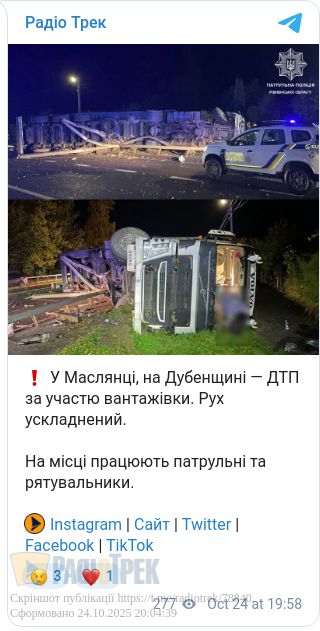 Вантажівка лежить посеред дороги: ДТП сталася на Дубенщині (ФОТО)