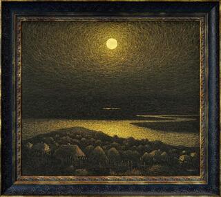 Пейзаж «Золота ніч» виконаний акрилом у неповторній манері пльонтанізму в період творчого розквіту майстра. На полотні зображено захід сонця над українським селом.