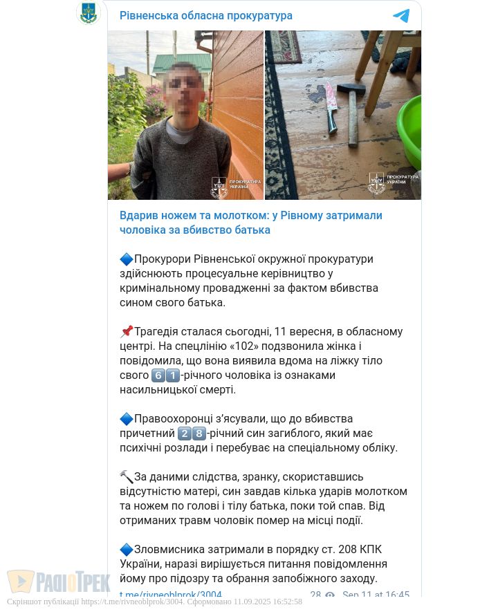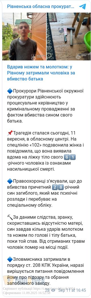 61-річний рівнянин повернувся додому напідпитку та ліг спати. Доки матері не було вдома, син вдарив його ножем, а потім наніс кілька ударів молотком по голові.