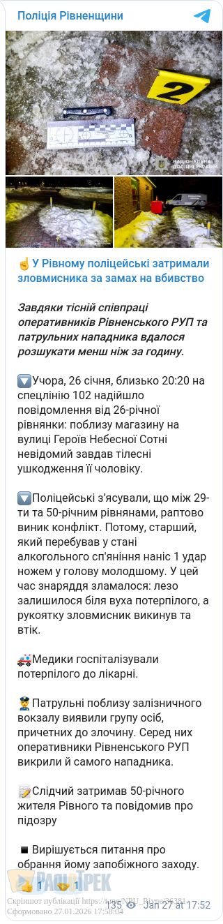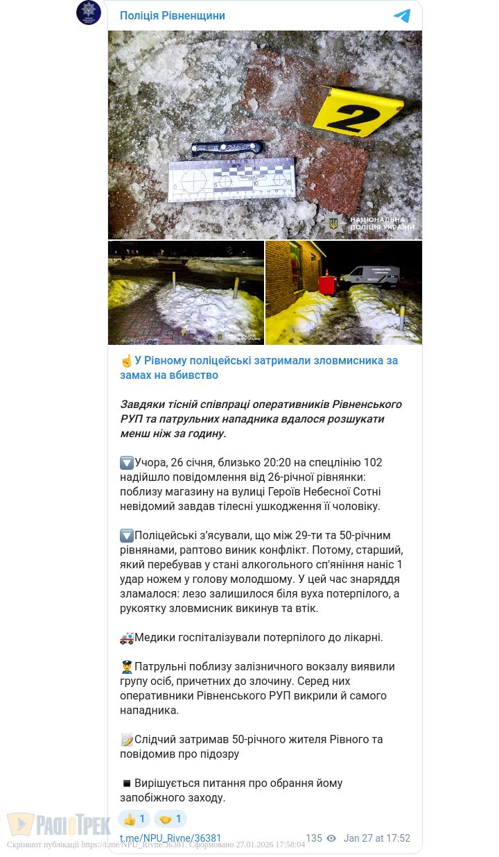 Його затримали оперативники Рівненського РУП, потерпілого госпіталізували, підозрюваному повідомлено про підозру.
